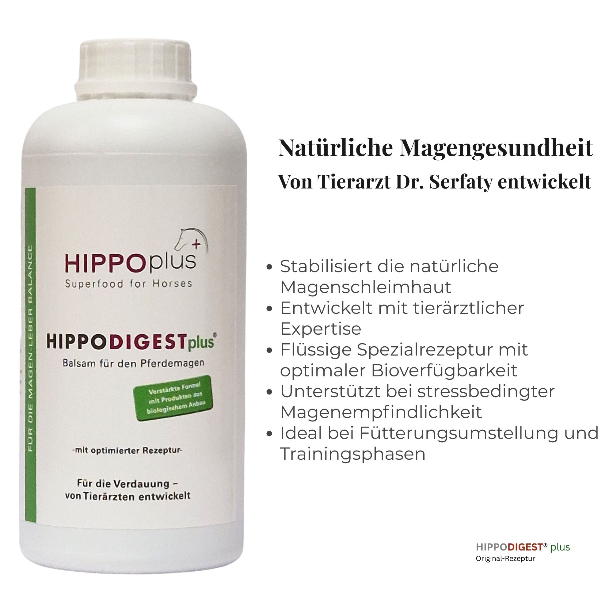 Die Rezeptur von HIPPODIGEST® plus wurde aus tierärztlicher Praxis heraus entwickelt und über Jahre mit Erfahrungen aus Zucht, Sport und Haltung weiter geschärft. Der Einsatz von Bio-Spirulina, die flüssige Dosierform, die sehr hohe Akzeptanz und die konsequente Ausrichtung auf magenempfindliche Pferde machen das Produkt bewusst zu einer Premiumlösung – nicht über Lautstärke, sondern über Formulierung, Funktion und Qualität.