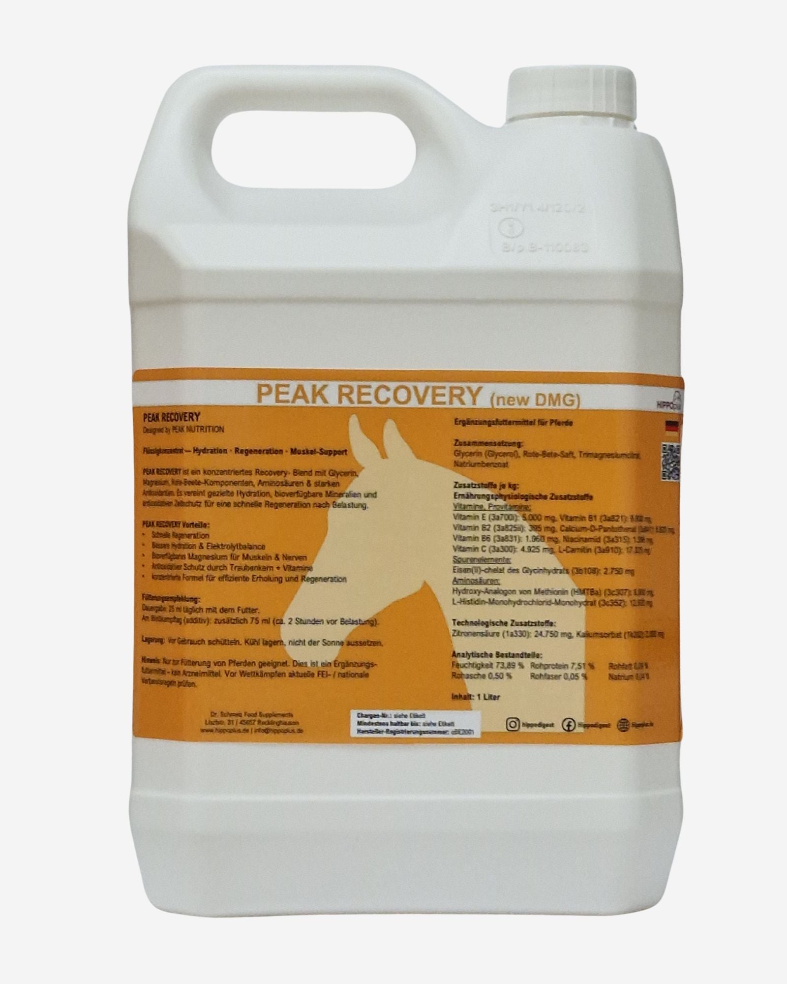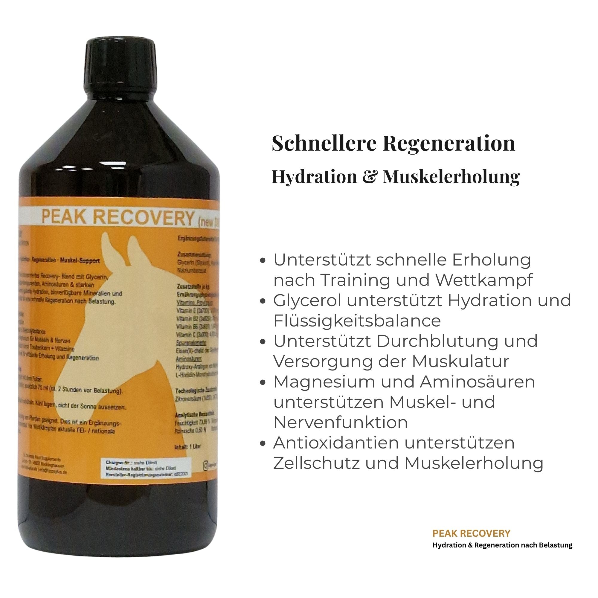 Flüssiges Ergänzungsfuttermittel zur gezielten Unterstützung von Regeneration, Hydration und Muskelfunktion nach Belastung.
